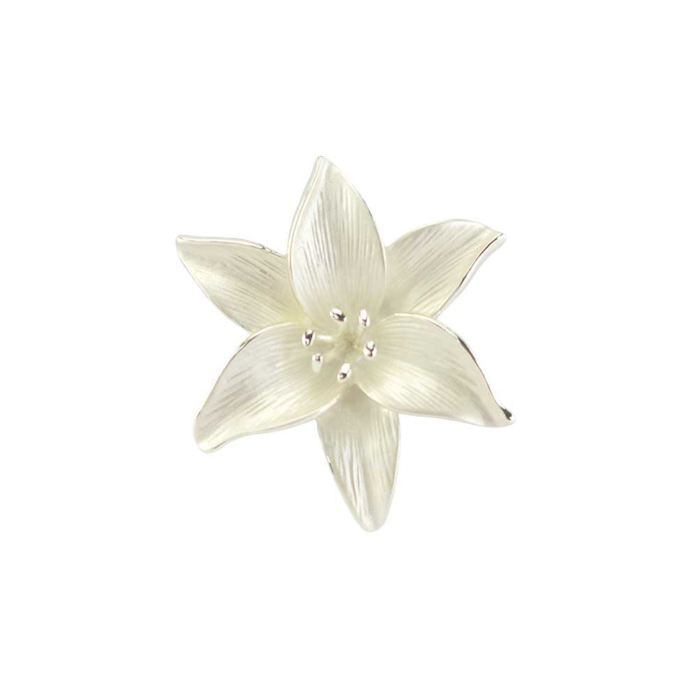 Silver coloured metal with a pearlescent white and silver lily.