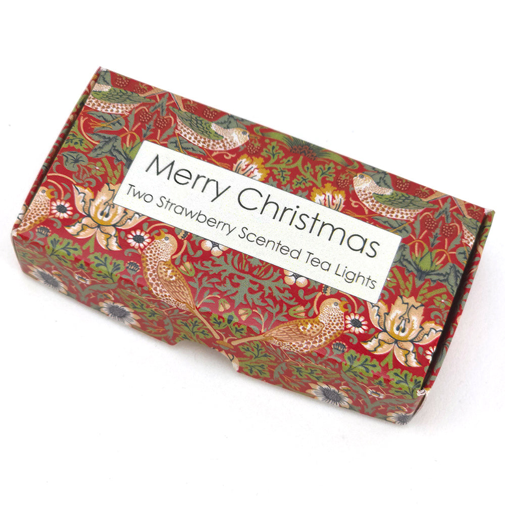 These mini boxes containing two strawberry scented tealights are in our exclusive Strawberry Thief design, which is inspired by William Morris and coordinates with one of our cracker making kits.